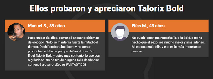 Los comentarios de quienes ya han probado Talorix Bold reflejan una experiencia muy positiva con este producto natural. Muchos hombres afirman sentirse con más energía, confianza y vitalidad en su vida íntima, notando cambios significativos con el uso constante.