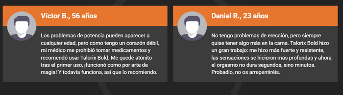 Los testimonios destacan que no solo han mejorado su rendimiento, sino también su estado de ánimo, motivación y bienestar general. Para muchos, Talorix Bold ha sido una solución discreta pero poderosa para recuperar el control y disfrutar nuevamente de su masculinidad sin recurrir a soluciones artificiales.