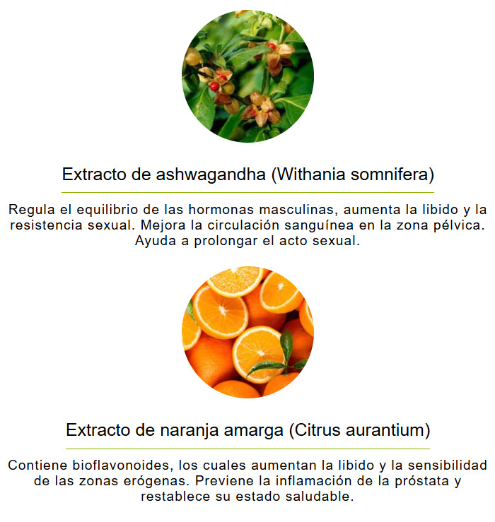 - Extracto de Ashwagandha (Withania somnifera) – Regula las hormonas masculinas, potencia la libido y mejora la resistencia sexual. Además, favorece la circulación sanguínea en la zona pélvica, ayudando a prolongar el acto sexual con energía y vigor.