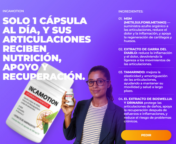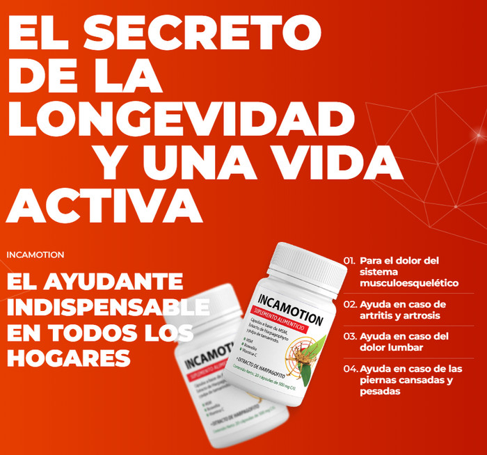 Mantener las articulaciones saludables es fundamental para vivir con libertad y energía. El dolor, la rigidez o la inflamación pueden dificultar el movimiento y afectar la calidad de vida. IncaMotion es un suplemento en cápsulas con ingredientes naturales diseñado para brindar un cuidado completo: revitaliza los tejidos, alivia las molestias y protege las articulaciones del desgaste diario, ayudándote a mantener una movilidad óptima a lo largo del tiempo.